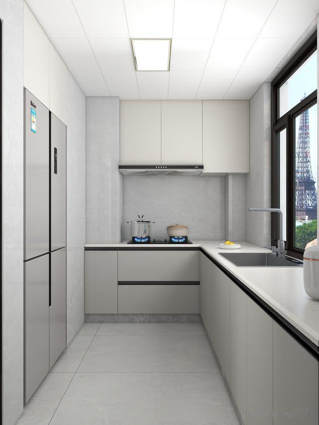 “厨房”的墙面砖铺贴的是浅灰色,地面砖是从客餐厅通铺进来的,而且墙面做了改造,将冰箱可以内嵌在墙体内部,上方还可以做一组储物柜。