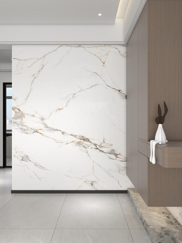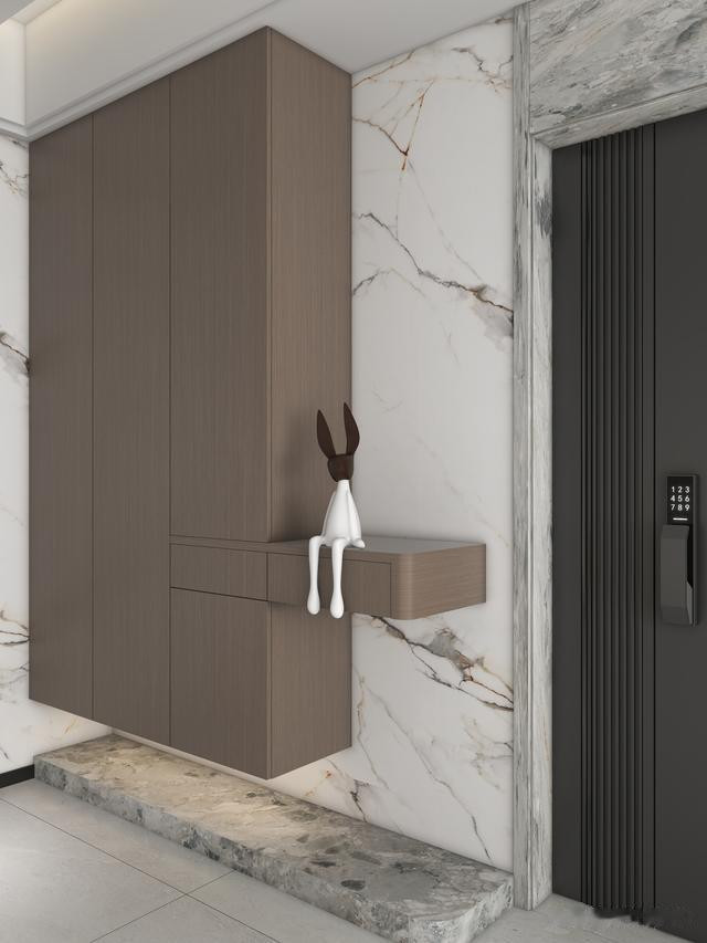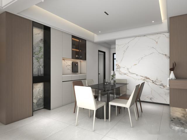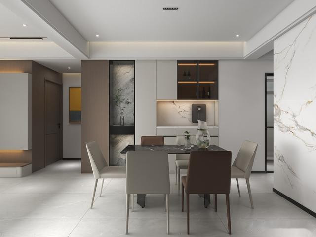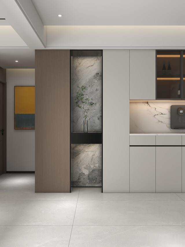 “餐厅背景墙”与鞋柜镂空的部分,都是采用岩板来铺贴的,看上去大方又有高级感,关键是还好打理卫生。