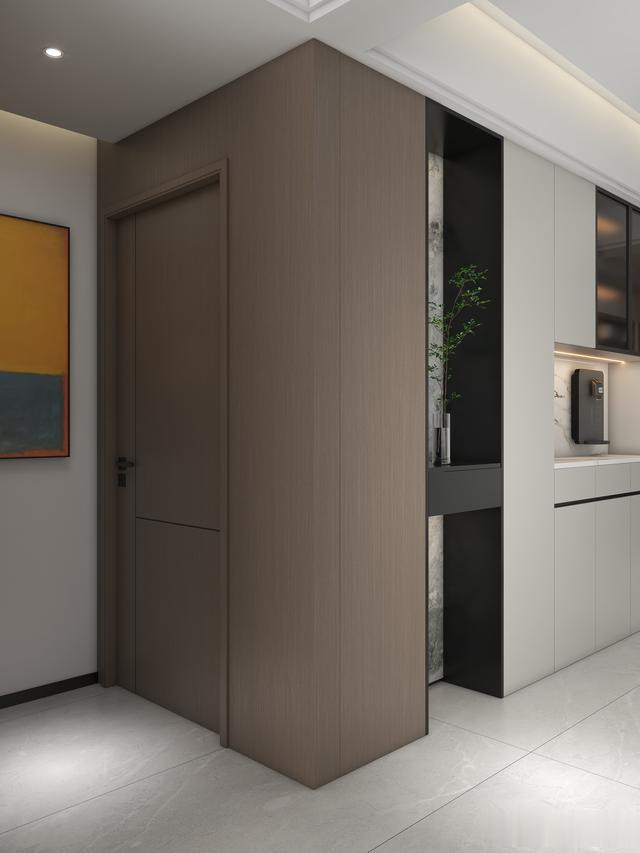 “玄关柜”是与餐边柜的布置在一起的,因为进门的对面就是一体柜了,不想显得单板,就做了一个端景柜。