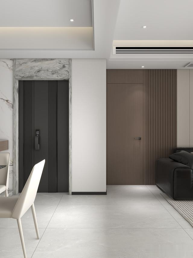 “房门”的颜色也是使用的胡桃木色,点缀了两条抽缝的样式,锁体是黑色的,简约又很耐看。