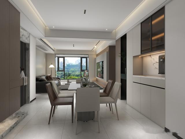 整体的装修风格是现代的,将餐桌布置在中间,将两边的墙面都布置了柜体,再点缀上硬装的搭配,让整个餐厅看上去很是漂亮实用,下面就一起来看看装修的效果吧。