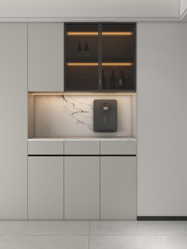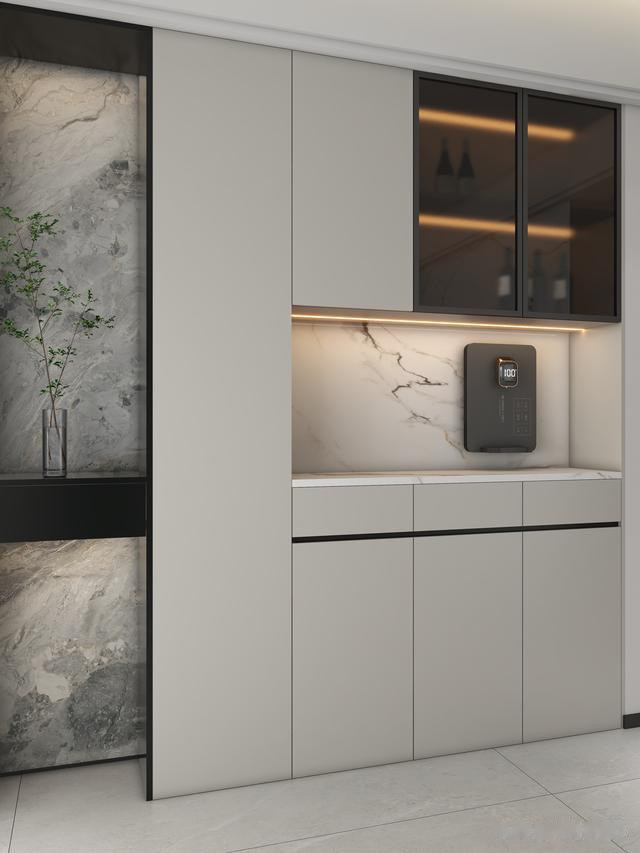 右侧的柜体地柜,是做了储物空间与抽屉的功能,不安装拉手,做了工艺槽,台面与背板都是岩板来装饰,还挂了一个管线机,用来接热水也很方便。